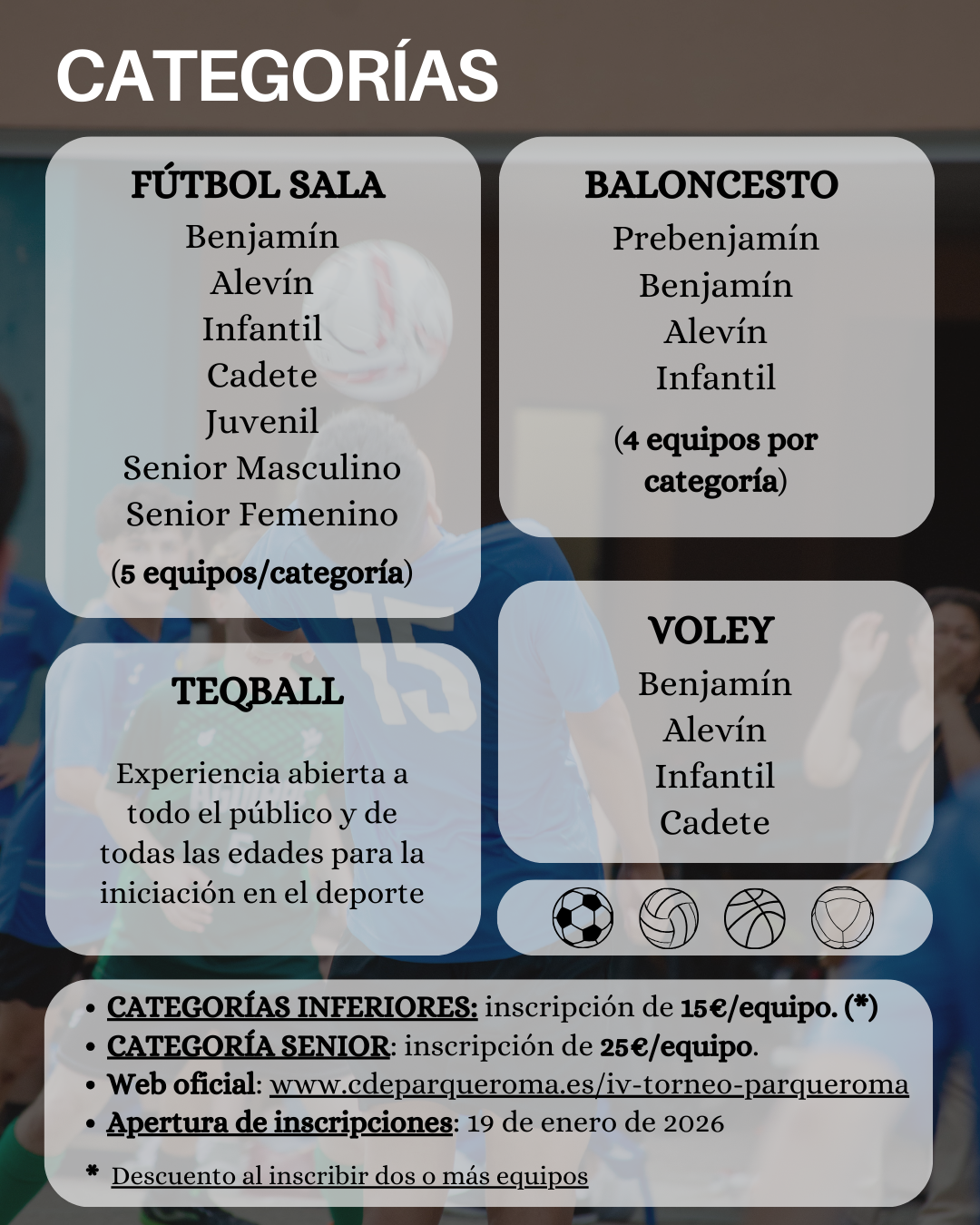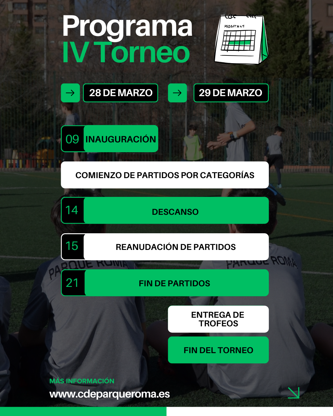 El cuarto torneo ¨Parque Roma¨ se celebrará los días 28 y 29 de Marzo de 2026, en el colegio Montserrat Fuhem, ubicado en la calle Juan Esplandiú, 2. El horario del torneo será de 09:00 a 22:00.